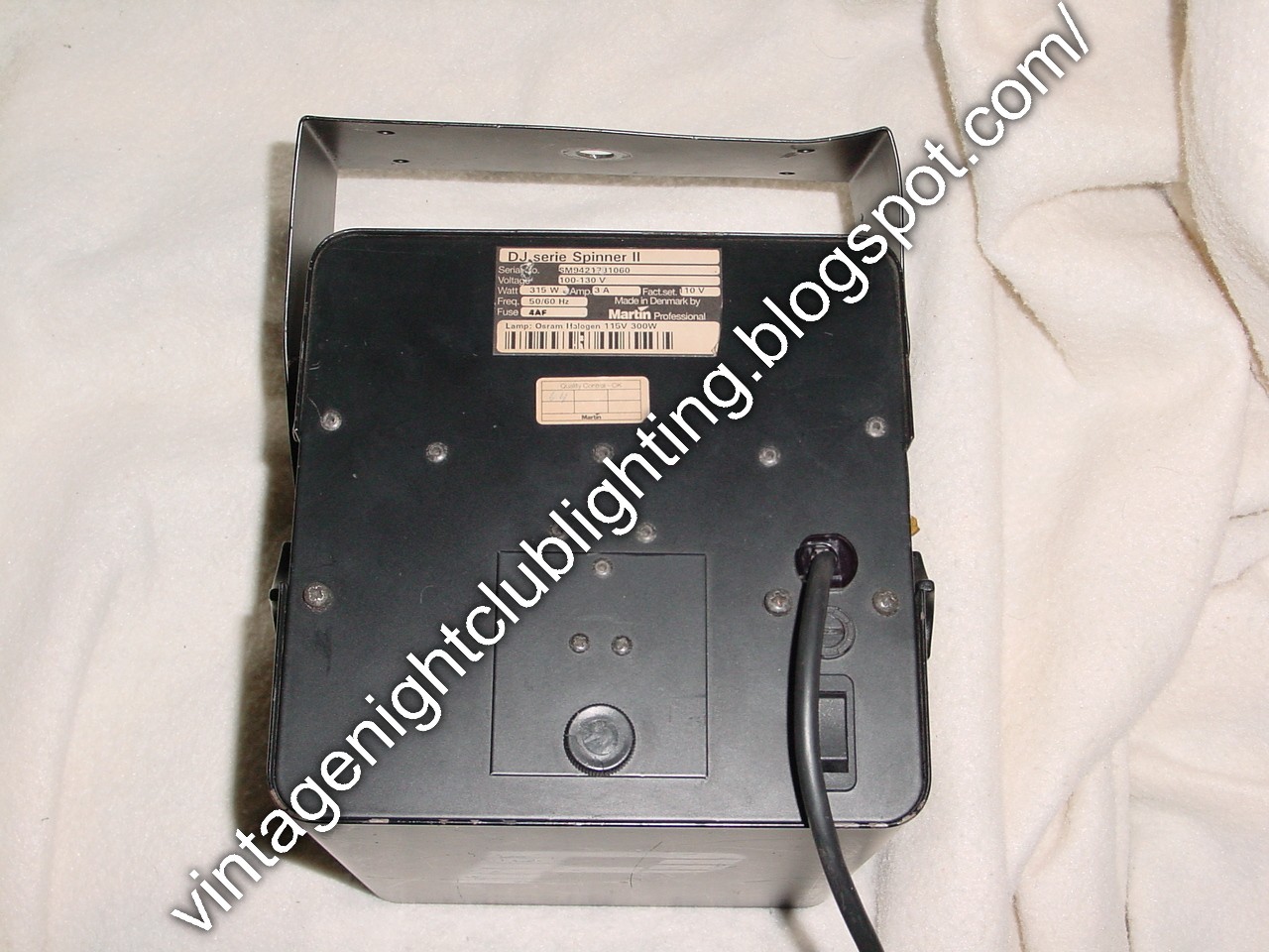 Super unique light!! This Spinner light is produced from Martin and is part of the DJ Series. Unit has a large rotating gobo wheel that moves to the sound of the music. Light is produced from a 300 watt bulb that is behind the gobo wheel. Once the light goes through the wheel it goes through a 4-way dichoric lens then finally out of a front lens. Unit has 2 motors. 1 for the gobo wheel and 1 for the cooling fan. Unit made in Denmark.