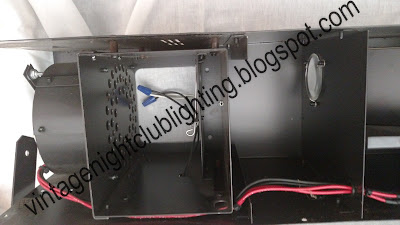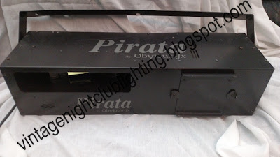 Another awesome unit from Sapro! This is the thriller UFO! It is a bit different than conventional UFO units as the center does not have a rotating saucer but a rotating mirrored pyramid. It features a 28 volt, 250 watt Aircraft Landing lamp (ACL) mounted in a housing that projects onto the pyramid. The mirrors are screen printed for colors (This was well before dichorics were the standard). The mirrored pyramid rotates at 30 RPM, the tumble rotates at 6 RPM and the base rotates at 20 RPM. All motors are super high quality Crouzet from France. The unit feature a ring of dowsers to keep the light from bleeding through. Separate circuits for each motor and lamp circuits (4 total). Unit made in France.