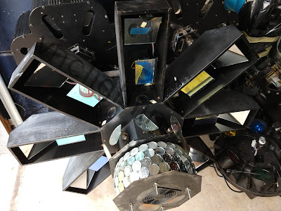 Gigantic Centerpiece from American DJ. This is the Megadoid HMI 575 centerpiece unit. It is by far HUGE to say the least! This is the clone of the Griven Helios unit. The unit has a central HMI 575 discharge bulb in the base of the unit producing a great amount of light. The light shoots out of 8 convex lenses mounted around the lamp. The light beams then hits 8 arms each consisting of 1 x dichoric glass reflector and mirror. This moves the beam of light in and out as an expanding and contracting motion. The beams can hit the dichoric glass then shoot a colored beam of light or bypass and hit the mirror creating a white / clear beam of light or both. In addition to the beams of light moving in and out there is a constantly rotating mirror drum on the bottom and an additional 8 sound active rotating glass mirrors that the beams of light can project off of. Control of the unit is 0 - 10 volt analogue that brings up the internal programs and the 8 round mirrors constantly rotate to the beat of the music from an on-board mic with sound adjustment pot for sensitivity. The original controller unfortunately has gone missing from the original owner - It was a small box that had an adjustment knob for the programs and a blackout button. A few cool features of the unit are that the mirror drum comes off with 4 simple wing nuts, a hinged base for easy bulb replacement, a hinged door for access the the PCB electronics and each of the 8 arms are detachable. 4 set screws and a quick release for the power wires and they come off. The unit is awesome to see in action! Unit made in Taiwan.