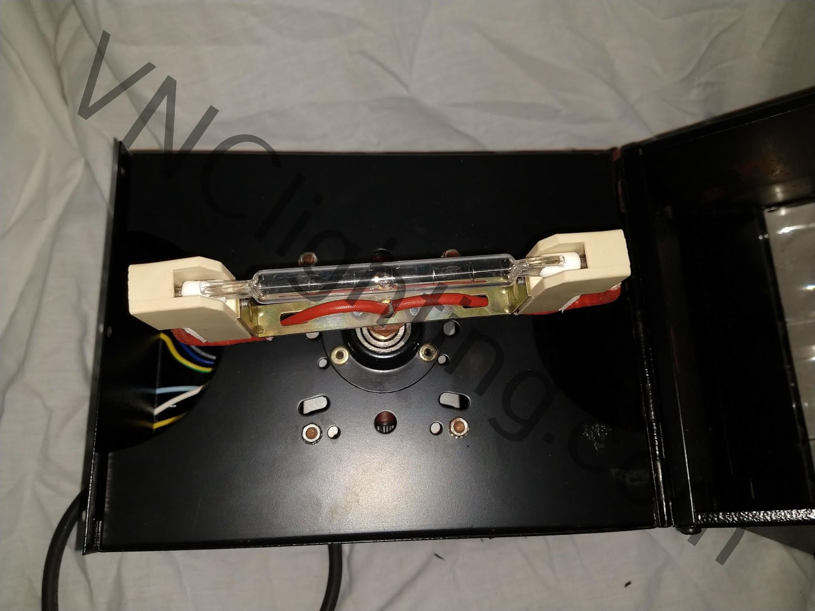 This is the larger of the 2 Kum units made by Satel. This is the Kum (Full Size - Chrome Version) light effect. Satel also made a smaller unit named the Baby Kum which has a single head and a central 150 watt light source. This unit features 20 - 12 volt, 35 watt AR111 PAR 36 lamps (10 on each side). You can also use standard glass 12 volt, 30 watt sealed beam lamps, but I prefer the AR111 lamps because they are lighter and have a much longer life expectancy. The unit is comprised of the large light unit and a dedicated controller. The controller features a switch to turn on the lamps, the AC motor (Which spins the 2 heads in opposite directions) and the DC motor (Which controls the main rotation of the entire unit). The DC motor also has a speed adjustment know so you can control how fast the main unit rotates. Both motors are very high quality and made from Crouzet of France. These units were available in black and chrome originally when manufactured. I have another unit that was originally chrome but was in really bad condition when it arrived so that one was refinished to black. Here is a link to that unit: Satel Kum - Black Version I am happy to have this chrome version as it is hard to find one of these that has survived from the 80's and still looks good. Unit made in Spain.